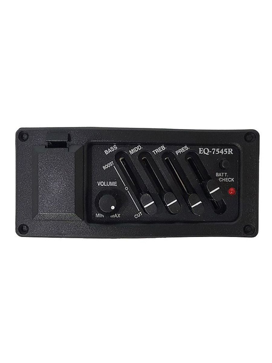 BaggZ EQ-7545R – качественный звукосниматель с четырехполосным эквалайзером для акустических гитар. BaggZ – это качественные звукосниматели, прочные чехлы и стильные ремни для гитар. Продукция фирмы изготавливается на крупном китайском заводе. Все товары проходят поэтапный контроль качества, маркируются и успешно поставляются в различные страны мира. Продукция фирмы BaggZ – прекрасное сочетание высокого качества и привлекательной цены. Особенности модели: – 4 полосы эквализации – регулировка уровня громкости, низких, средних и высоких частот – функция реверса фазы для подавления обратной связи – соединительные провода в комплекте Элегантный и компактный дизайн EQ-7545R позволит вам с легкостью вмонтировать прибор в корпус гитары. BaggZ EQ-7545R – это надежный и доступный по цене эквалайзер, который значительно улучшит звучание вашего инструмента.