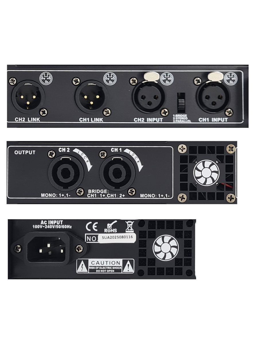 Описание модели: усилитель мощности двухканальный Класс: D Мощность RMS/Пик (4 Ом): 2х600 Вт Мощность RMS/Пик (8 Ом): 2х400 Вт Частотный диапазон: 20-20000 Гц Соотношение сигнал/шум: >105 дБ Входное сопротивление: 20 кОм (балансный), 10 кОм (небалансный) Перекрестные помехи: >75дБ Разъемы: вход XLR, 1В, 20 кОм (балансный), 10 кОм (небалансный) Источник питания: AC 100~240 В, 50/60 Гц Размеры (ШxВxГ): 484×375×44 мм